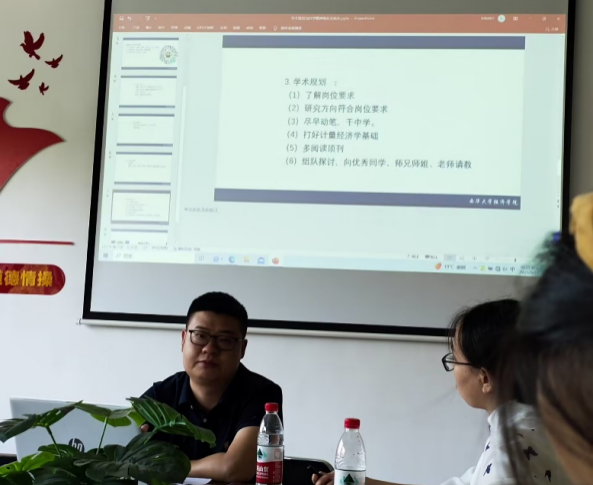 胡江老师则从专硕未来工作方向以及学术规划角度分享了自己的经验和建议。其指出学生应当了解工作岗位的需求,确定研究方向是否符合岗位需求。在学术规划方面,胡江老师建议学生多阅读金融学领域的顶刊,积极向身边优秀的同学和老师学习,在阅读与学习的过程中打好计量经济学的基础。