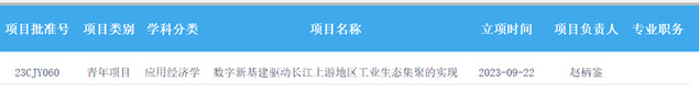 近日,全国哲学社会科学工作办公室公布了2023年国家社会科学基金年度项目和青年项目立项名单,我院赵柄鉴博士主持的“数字新基建驱动长江上游地区工业生态集聚的实现路径研究”获批国家社科基金青年项目。
