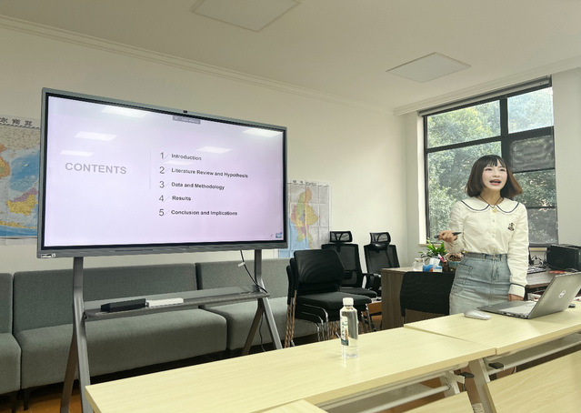 论坛上,何春燕博士做了题为“Does local government debt impede corporate green innovation efficiency. Evidence from the LGFVs in China”的报告,实证探究了地方政府债务对企业绿色创新效率的影响。龚星宇博士做了题为“健康冲击与消费平滑:数字普惠金融的作用”,探究了数字普惠金融在健康和消费中发挥的作用。