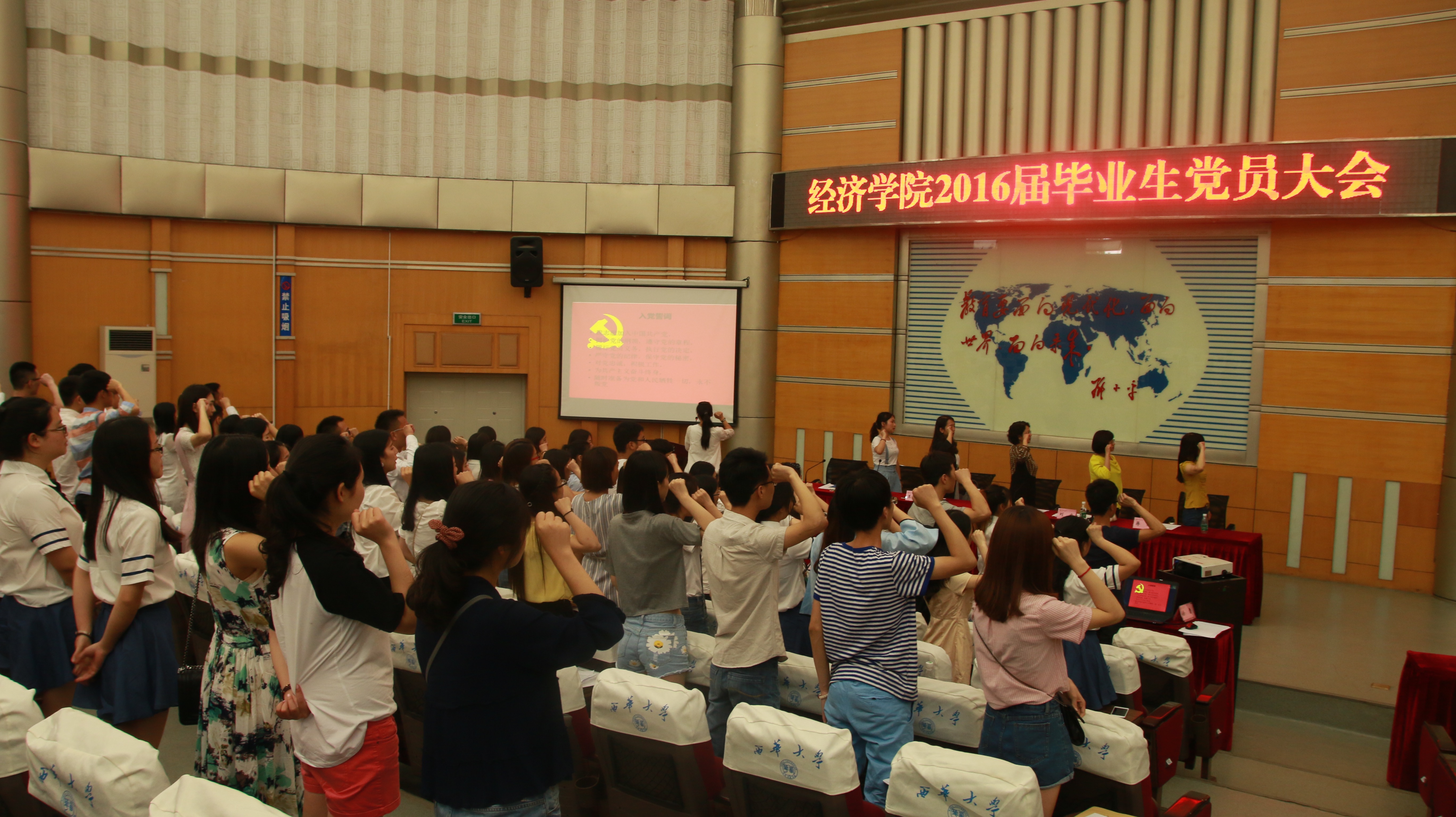 5月19日下午16点,经济学院2016届毕业生党员大会在四教报告厅举行。学院党委书记兼副院长李雪玫、学工办主任兼学生党总支书记王惠莹、商务管理系主任徐雷、学院团委书记刘雪梅和辅导员刘容、蒋丽老师以及全体毕业生党员参加了本次会议。