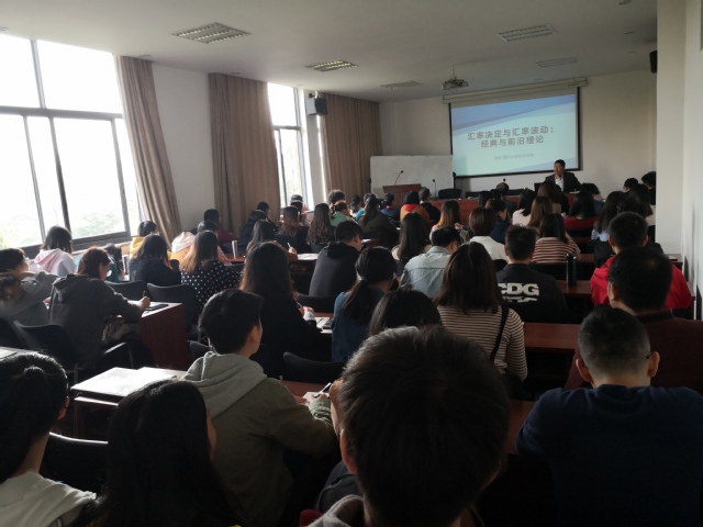 主讲人罗航院长由“为什么研究汇率问题?”这个问题入手,从金本位制、购买力平价说、利率平价说、考虑生产差异的货币主义模型以及资产组合模型等这些经典与前沿理论,给在座的同学们分析了外汇市场上汇率决定与波动的情况,使同学们对于汇率的知识有了更深层次的理解与领悟。与此同时,罗航院长对于研二同学即将到来的论文开题报告提出了中肯的建议。在讲座结尾,大家进行了深入交流讨论,现场气氛十分热烈。
