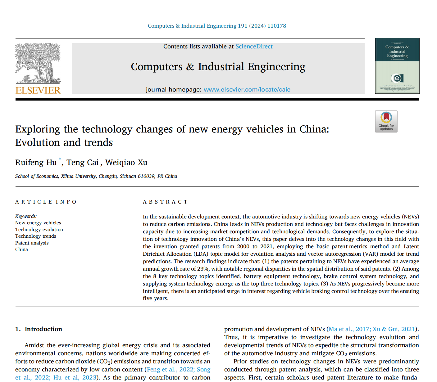 近日,bevictor伟德胡锐峰博士团队在SCI期刊《Computers & Industrial Engineering》(中科院一区,ISSN:0360-8352,近三年影响因子为6.7)发表题为“Exploring the technology changes of new energy vehicles in China: Evolution and trends”的研究论文。胡锐峰博士为论文的第一作者,2022级硕士研究生蔡腾为第二作者,西华大学为论文的第一完成单位。