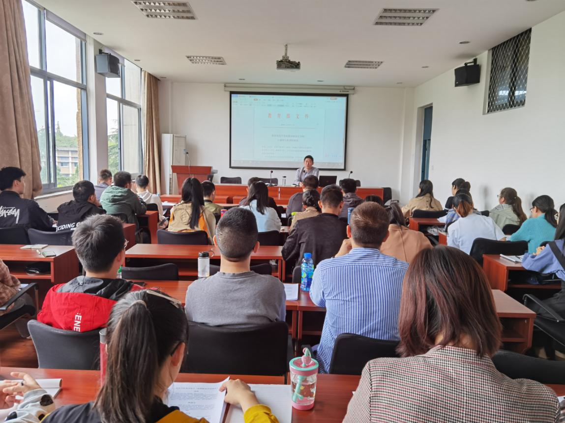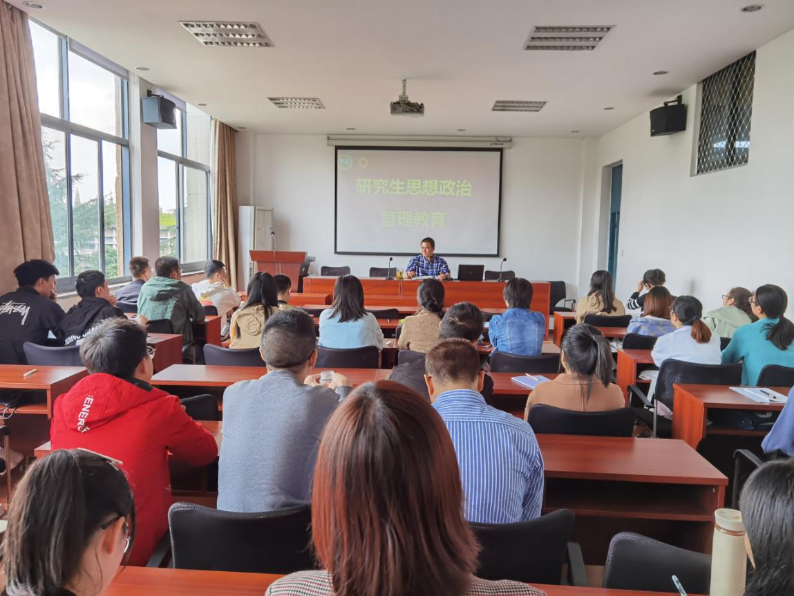党委副书记易宇峰进行了“研究生思想政治管理教育”,从学校、学院规章制度、校园安全问题等角度出发,细细解读,强化学生自我约束能力,为同学们接下来的研究生生活竖起坚实的壁垒。