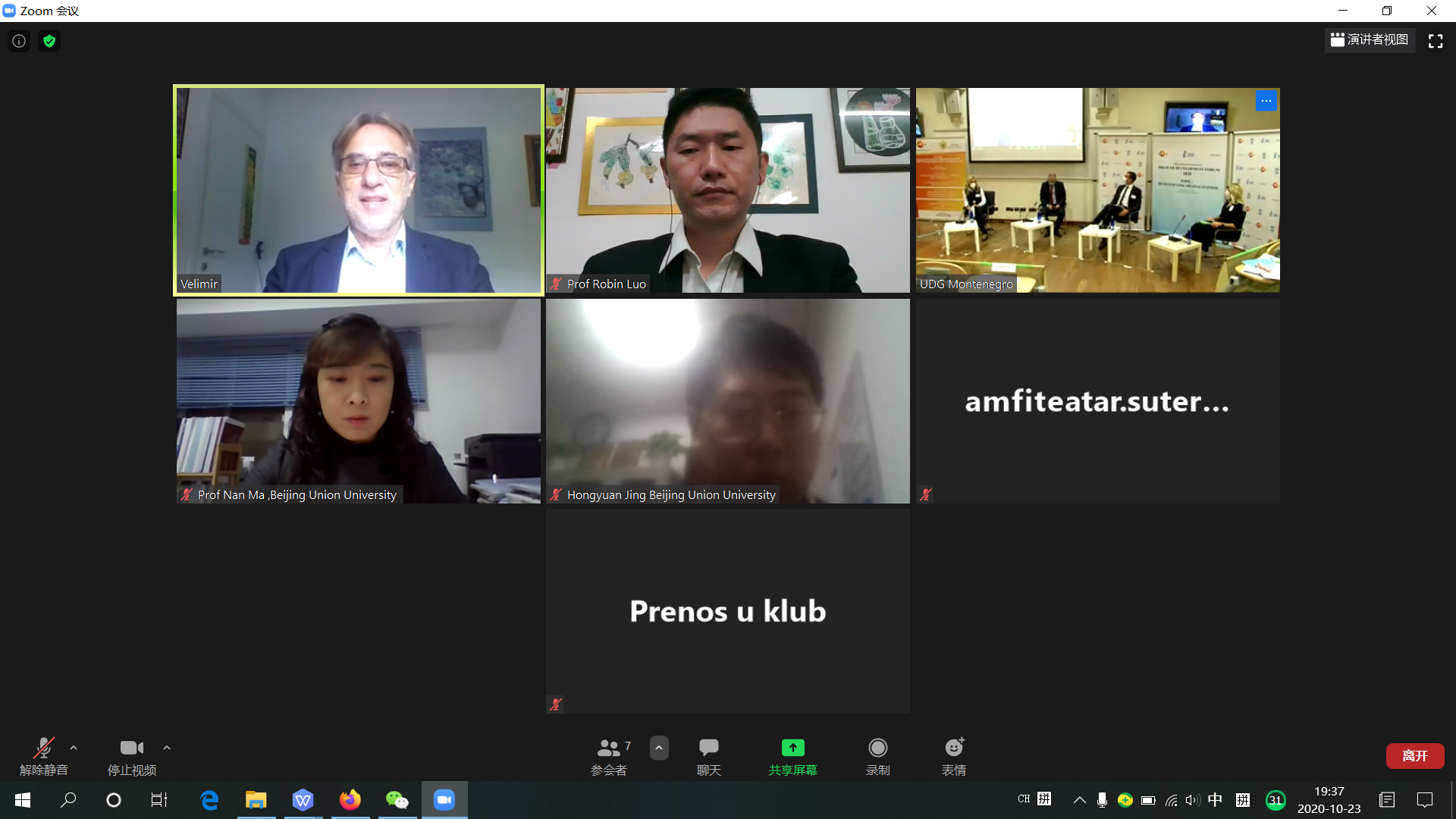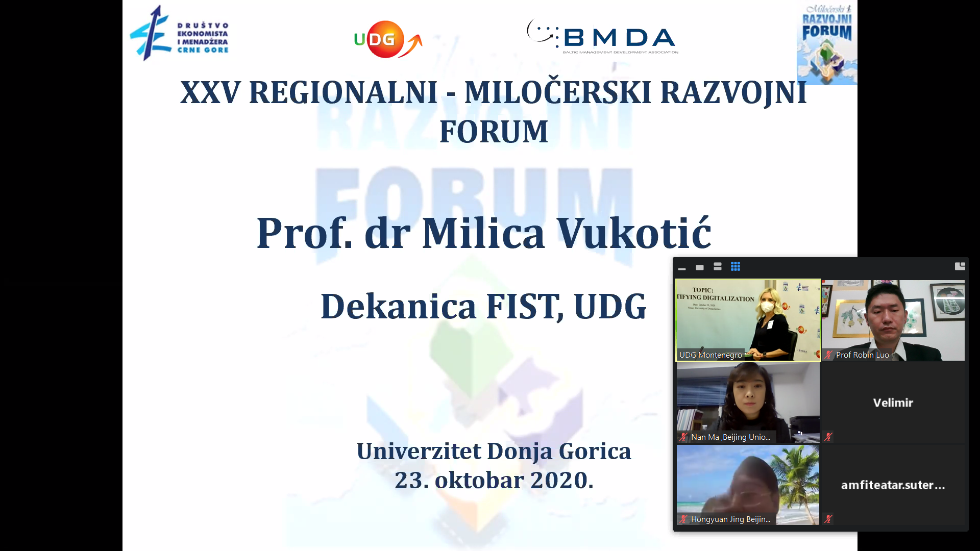 2020年10月23日,由黑山共和国经济学家和管理人员协会(ASSOCIATION OF ECONOMISTS AND MANAGERS OF MONTENEGRO)主办,下戈里察大学(UNIVERSITY OF DONJA GORICA)和波罗的海管理发展协会(BALTIC MANAGEMENT DEVELOPMENT ASSOCIATION)联合承办的“XXV MILOCER DEVELOPMENT FORUM”(第25届米洛瑟发展论坛)国际高峰论坛通过线上+线下方式顺利举行。会议由下戈里察大学校长Veselin Vukotic教授主持,黑山共和国科技部部长Sanja Damjanovic博士出席并致辞。多个国家的20余名政府官员和知名学者受邀参加圆桌论坛。我院院长罗航教授受邀参加论坛,并以“高等教育对社会与经济数字化进程的支持”为题发言。圆桌论坛发言结束后,受邀嘉宾还回答了线上线下多名参会者的提问。