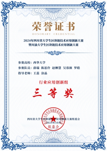 本次大赛分为应用创新组和技术创新组两个赛道,旨在推动区块链技术在高校中的普及和应用、激发大学生的创新思维和实践能力。经过前期校赛选拔,按照大赛组委会要求,西华大学最终推荐4支队伍与其他来自四川、重庆多所高校的三百多名学子组成的84支队伍展开角逐。经过省级初赛方案评审和选拔,由2022级金融科技专业的薛瑞、陈思伶、赵柳慧、吴蓉颜、罗皓,以及2022级金融科技专业的谭佳洋、查欣雨、雷鹄源、陈芯悦以及2022级电商专业的沈世豪组成的两支队伍成功入围省级复赛。