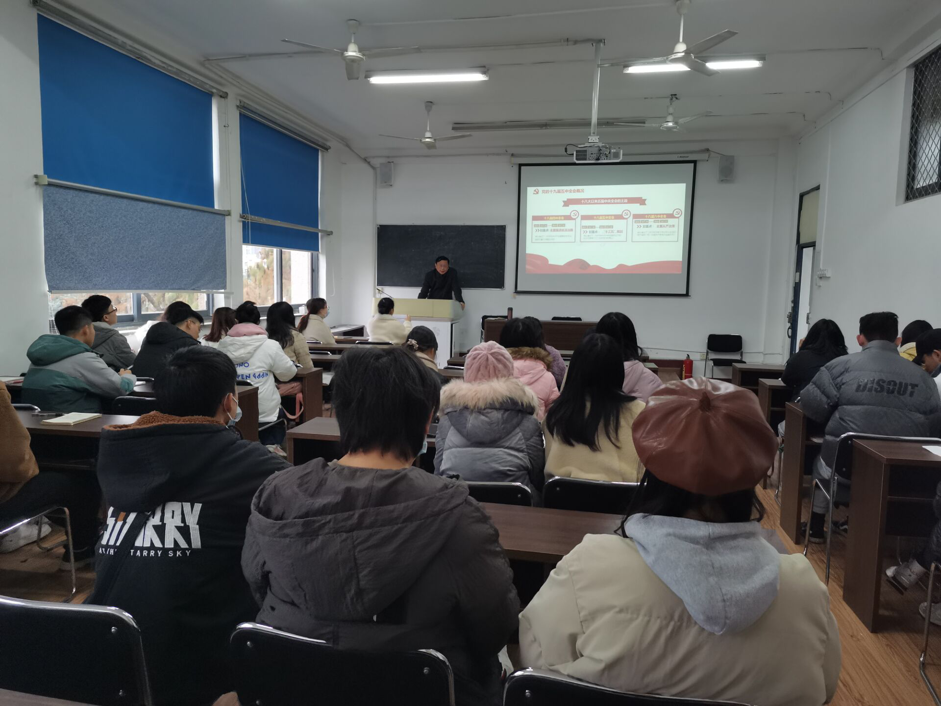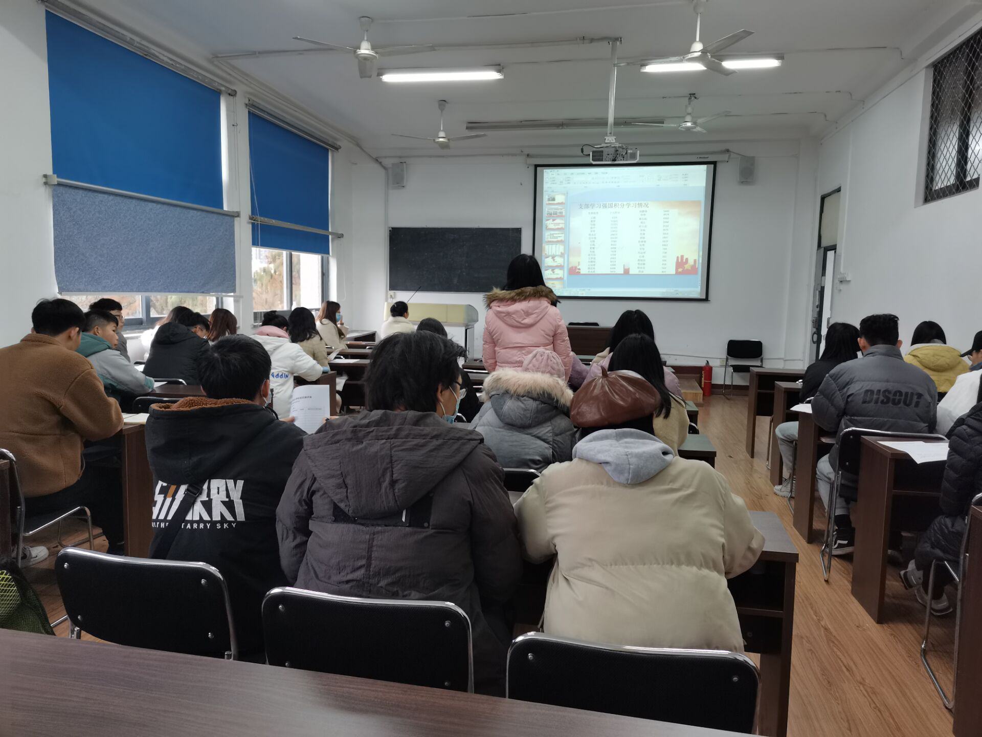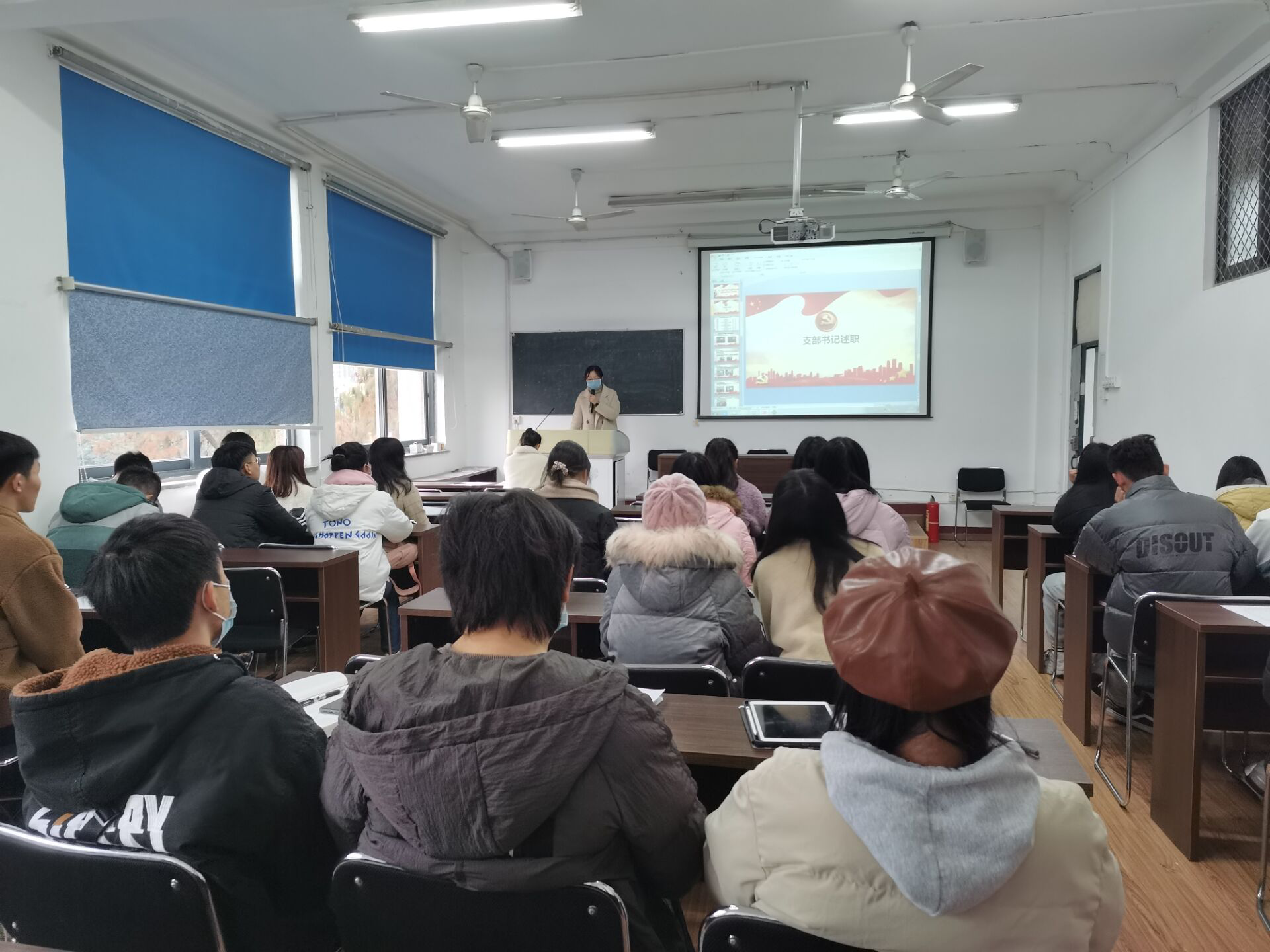 会议第四项,兰虹院长为大家上党课,兰院长讲解到中国社会主义制度的优越性:在抗击疫情中,中国控制快,后续不论天津、新疆、青岛发现快控制快。遇到疫情,脱贫也按期完成,党员同志交党费、大学生吃土豆给扶贫做贡献,所以所有党员要有使命感,看到党的伟大。在良好的制度下,大学生要有自信心,穿鞋舒不舒服只有自己知道,入党好不好只有自己知道,为党的事业读书,培养自己的能力。强调学生党员要重视学习,在学习和生活中充分发挥先锋模范作用,要将学习学科理论、政治理论和关心国家大事融为一体,做到理论联系实际;通过讲述系列历史实事提醒学生党员们要树立忧患意识,坚持制度自信,要珍惜当下优良的学习环境,努力学习报效祖国。