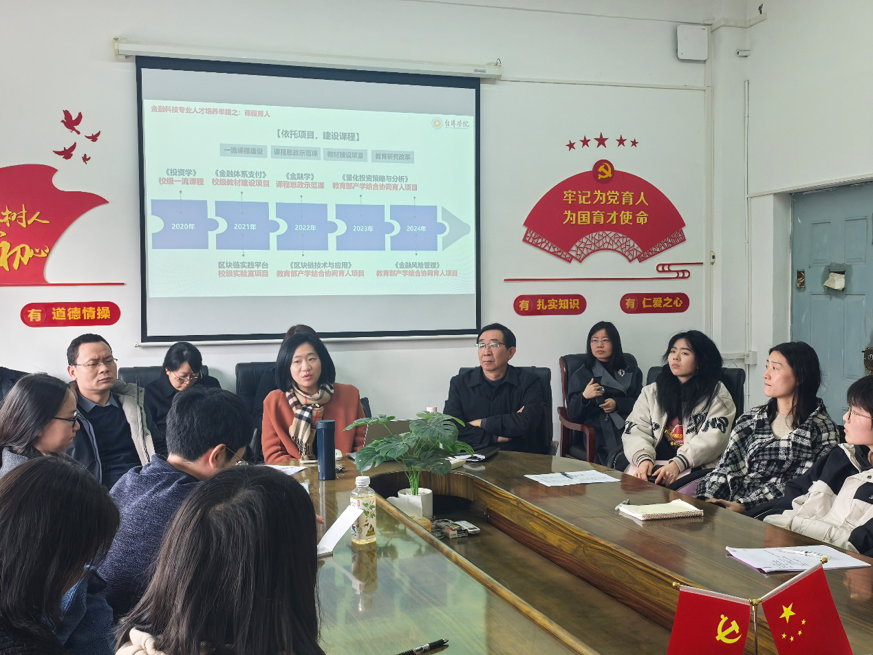 随后,金融投资系主任王蕊以“智融科技力,筑梦金融途:课-赛-训一体化专业建设”为主题,详细介绍了金融科技专业人才培养的思路,并展示了专业课程配置流程图。她从课程育人、实践育人、竞赛育人、科研育人、导师育人等五个方面,介绍了金融科技专业人才培养举措。首先,学院和系部依托教育部产学合作协同育人项目、课程建设项目等各项课题,积极建设一流课程,打造多元化实践教学环境。同时,建立一批与行业需求紧密对接的实验实训平台,如“区块链综合教学平台”、“量化实验教学平台”等,为学生提供优质的实践学习资源,并多渠道拓展校外实习基地,增强学生的实践能力和就业竞争力。第二,王蕊鼓励同学们参与各类学术竞赛和科研项目,通过实践锻炼提升学生的科研素养和创新能力。近年来,我系学生在“新道数智人才杯”全国大学生区块链应用技能全国总决赛等赛事中取得了优异成绩,并通过开展“金融科研育人”活动,进行定期的学术研讨。金融投资系的教师们将为同学们提供专业的指导,为同学们专业技能和科研素养的提升保驾护航。最后,王蕊就金融科技专业的班导师制度展开介绍。她强调,班导师制度建设目的是重视与学生的联系,后期将通过专业认知教育、专业认知实习、学生座谈会、科研训练、学科竞赛、座谈会、青年导师进班会等方式进一步推进班导师制度的建设,加强师生在学校、科研及实践等方面的联系。