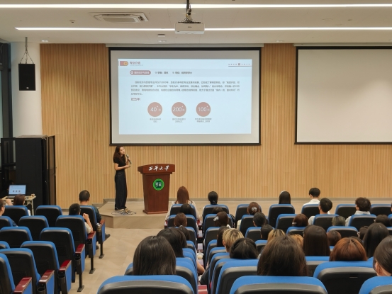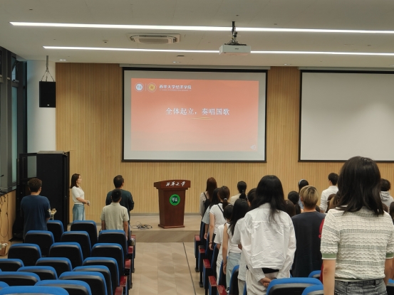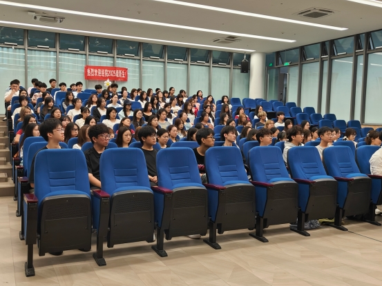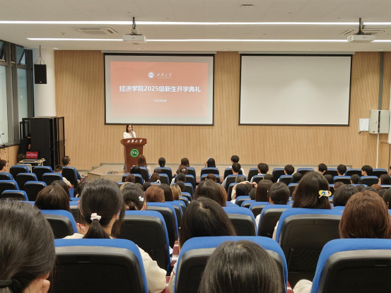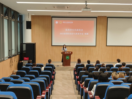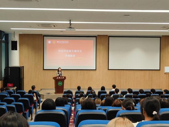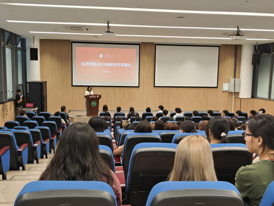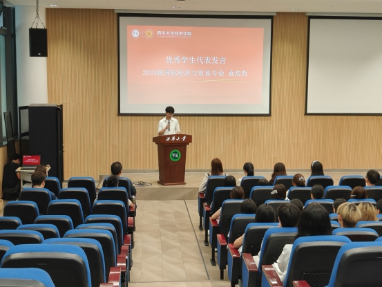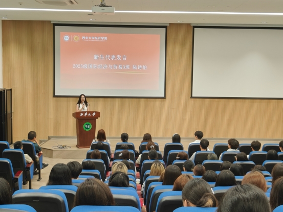 随后,教师代表黄茂致辞。她结合自身教学科研经历,勉励新生要珍惜大学时光,夯实专业基础,培养独立思考能力,同时积极参与实践,将经济学理论与社会发展紧密结合,成长为具有家国情怀和国际视野的经世之才。