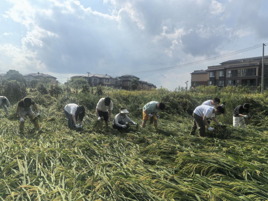 从插秧到收割,我们见证了生命的成长,收获时节几天阴雨,大片水稻已经伏倒,很多收割机割不到,抢收不及就会烂在地里,更体会到粮食的来之不易。学生党员陈思伶擦拭汗水感慨道,抢收下来的稻穗,是劳动的果实,更是共产党员践行初心使命的重量。