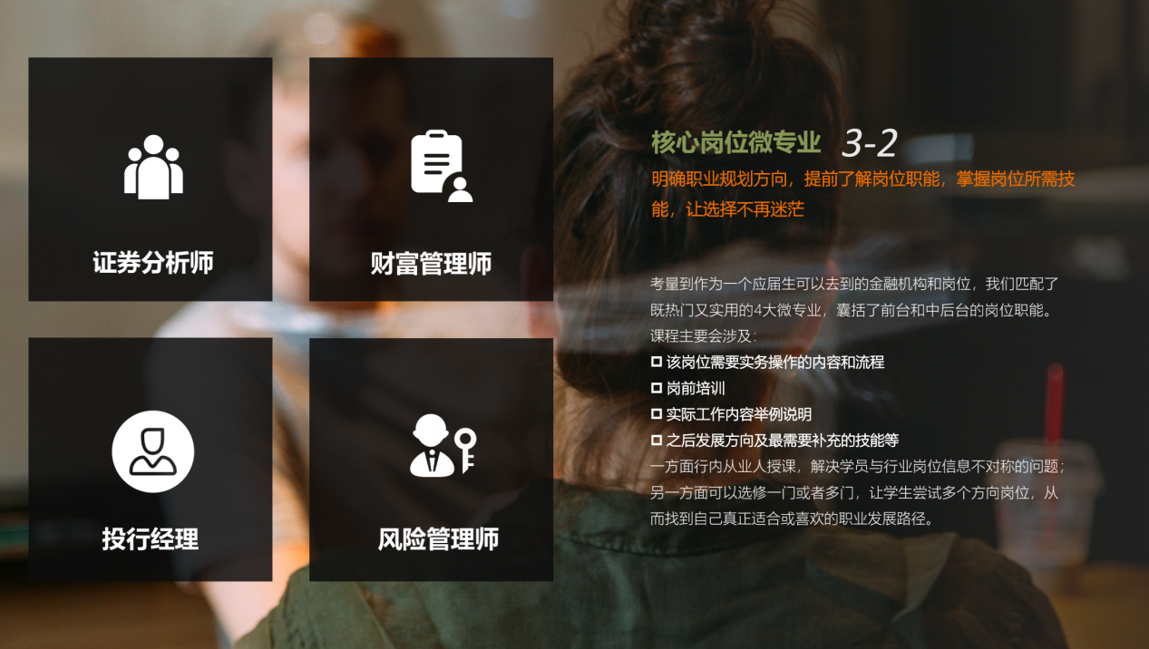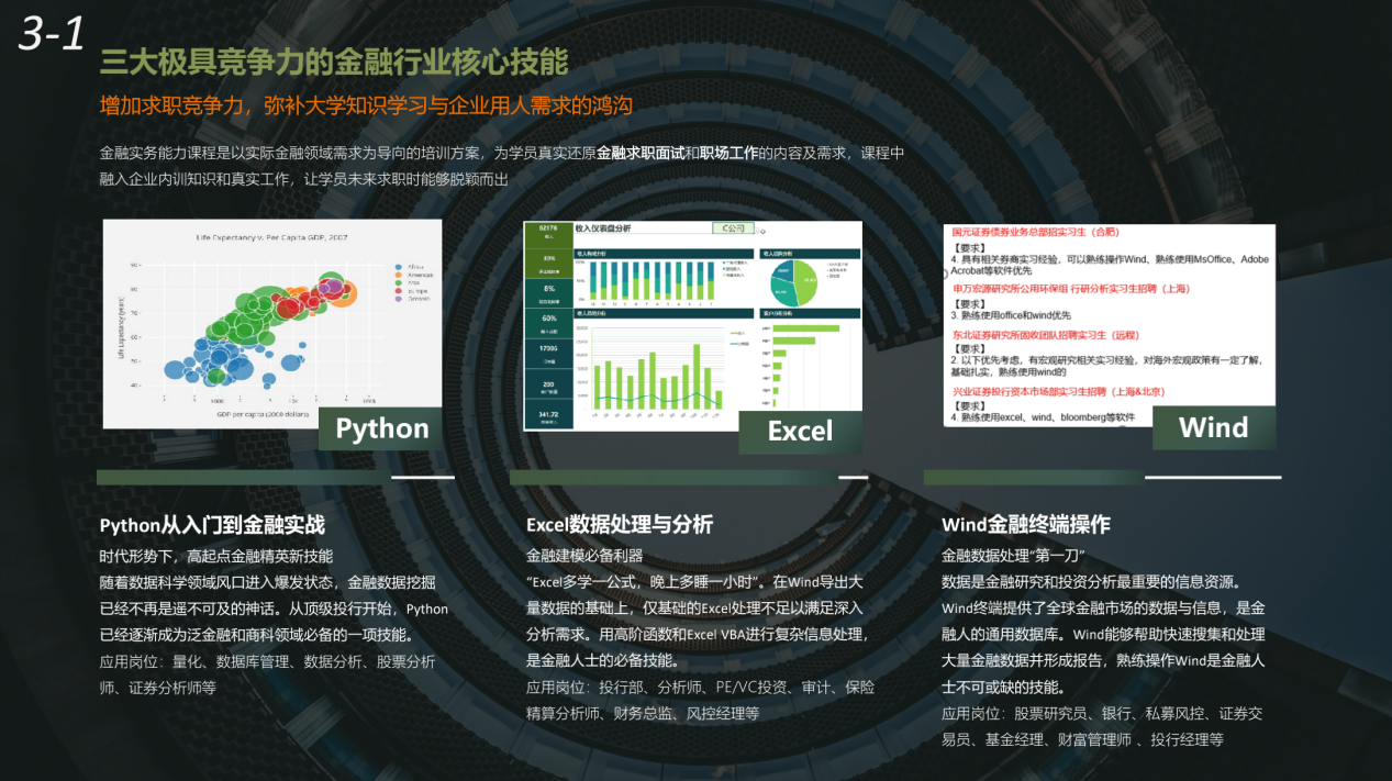 大量实务课程指导:三大华尔街金融必备技能Wind、Excel、Python,两大高级实务技能尽职调查、投资策略,四大岗位微专业