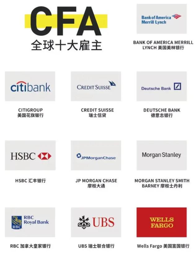 认可CFA的金融机构有:中国工商银行、中国建设银行、中国农业银行、中国银行、摩根大通、摩根士丹利、汇丰银行、美国银行、富国银行、德意志银行、瑞士信贷银行、花旗集团、瑞银集团、毕马威会计师事务所、普华永道会计师事务所、安永会计师事务所、中信证券、国泰证券、华泰证券、招商证券、广发证券、海通证券、申万宏源、银河证券、中信建投、中金公司、易方达基金、天弘基金、广发基金、汇添富基金、南方基金、华夏基金、博时基金、嘉实基金、富国基金、工银瑞信基金、中国平安、中国人寿、高瓴资本、上海证券交易所等。(往往偏向于管培生岗位或投融资部门、风险管理部门、资产管理部门、行业研究部门等)