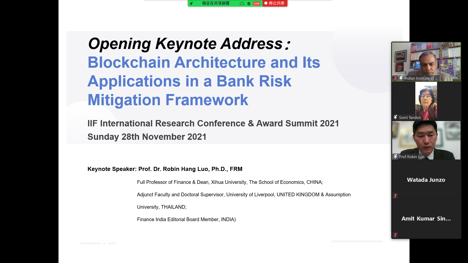 2021年11月27-28日和12月1-2日,由印度金融研究院(Indian Institute of Finance)主办的International Research Conference & Award Summit 2021国际学术会议通过在线方式顺利举行。会议由印度金融研究院院长J.D.Agarwal教授主持,来自46个国家、86所高校的500余名学者参加了本次学术会议,会议全程通过Facebook等主流媒体全球直播。