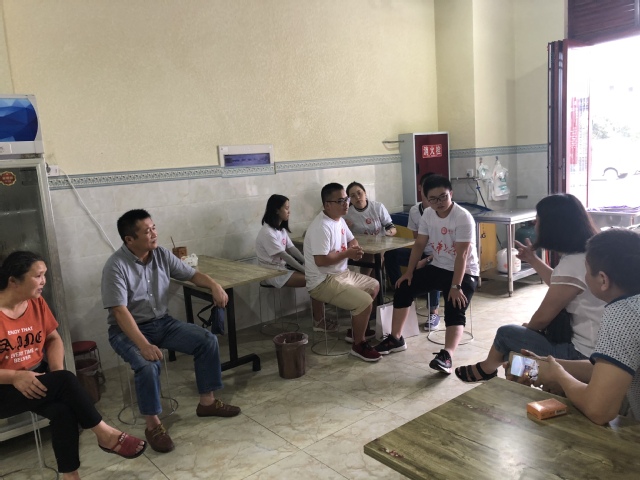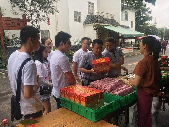最后,在战旗村工作人员的带领队员们拜访杨姐狗蹄粽,品尝战旗村的特色粽子。店主与队员们充分交流,提出相关具体的诉求,即想通过电子商务模式,进行线上销售,增加销售渠道,实现销售量增长,并且在产品包装和互联网销售方面也想得到专业的建业和指导。