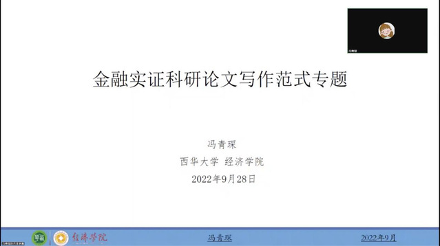 最后,支部成员冯青琛老师围绕金融实证论文写作范式进行专题讲座。冯老师首先简单介绍了金融实证论文的基本结构,然后重点围绕实证论文的范式和每部分内容进行了详细介绍。在此基础上,还分别以一篇英文论文和一篇中文论文为例,给大家演示了论文汇报的要点。