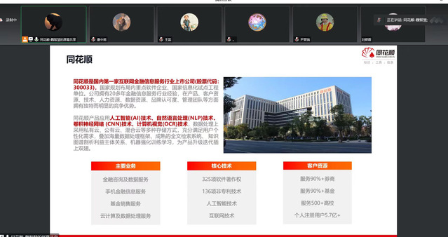 首先,魏智慧老师向同学们介绍了同花顺以及“云上•雏鹰计划”线上实习项目的背景。同花顺是国内第一家互联网金融信息服务行业上市公司(股票代码:300033),主要有金融信息服务和AI人工智能技术两大板块。本次“云上·雏鹰计划”是该公司基于疫情防控大环境,解决学生跨区域实践实习困难、促进复合型人才培养而建立的校企深度合作项目。该项目依托同花顺AI数据标注平台,由学生远程进行数据人工处理等相关工作。