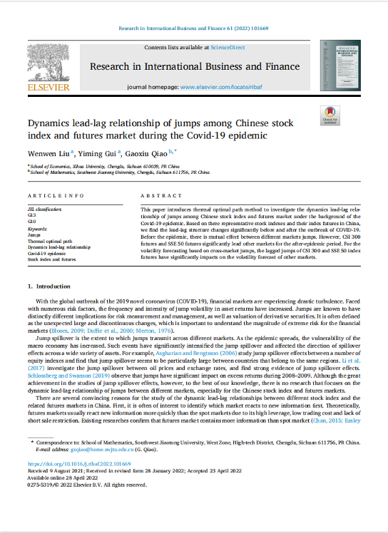 刘老师的论文《Dynamics lead-lag relationship of jumps among Chinesestock index and futures market during the Covid-19 epidemic》于2022年7月发表在SSCI期刊《Researchin International Business and Finance》(JCR一区)。该论文引入最优路径方法,研究了新冠肺炎疫情下中国股指与期货市场跳跃的动态滞后关系。