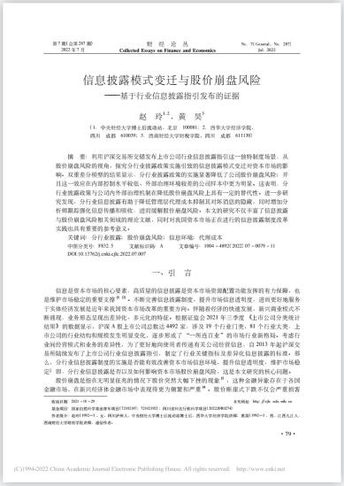 赵老师的论文《信息披露模式变迁与股价崩盘风险——基于行业信息披露指引发布的证据》于2022年7月发表在CSSCI期刊《财经论丛》。该论文基于上市公司行业信息披露指引这一独特制度场景,探究了分行业信息披露政策实施引致的信息披露模式变迁对资本市场定价效率的影响。