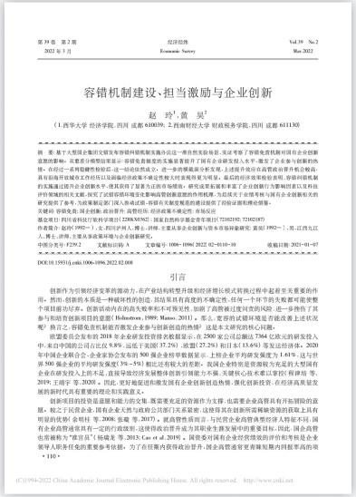 赵玲老师的论文《容错机制建设、担当激励与企业创新》于2022年3月发表在CSSCI期刊《经济经纬》。该论文基于大型国企集团交错发布容错纠错机制实施办法这一准自然实验场景,实证考察了容错免责机制对国有企业创新意愿的影响。