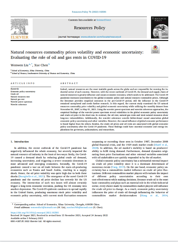刘文文老师的论文《Natural resources commodity prices volatility andeconomic uncertainty: Evaluating the role of oil and gas rents in COVID-19》于2022年2月发表在SSCI期刊《Resources Policy》(JCR一区)。该论文用小波功率谱和小波相关性方法揭示了全球经济政策不确定性的波动性以及短期内的原油价格。