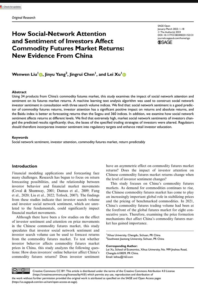 bevictor伟德刘文文教授和2018级研究生杨瑾谕合作撰写的论文“How Social-Network Attention and Sentiment of Investors Affect Commodity Futures Market Returns: New Evidence From China”在SSCI期刊 《Sage Open》(JCR二区)上发表(2023年1月,第1-3期,1-18页),由Elsevier(爱思维尔)出版社出版。