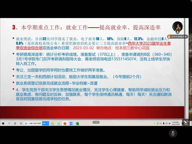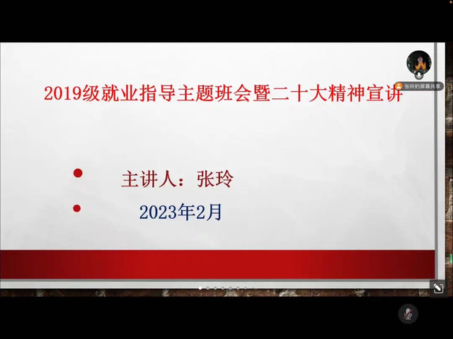 新学期开始,同学们陆续返校、实习上岗,开始新篇章的生活。2月28日晚,2019级金融科技、保险、电商专业学生在腾讯会议共同参与本学期第一次就业指导主题班会暨学习贯彻党的二十大精神宣讲,本次班会由辅导员张玲主讲。