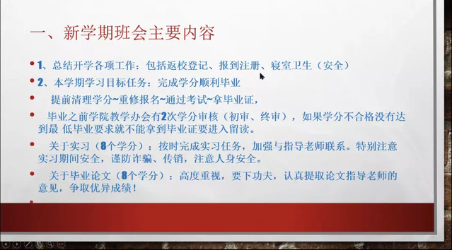 会议开始,张玲介绍了本次会议主题,并小结开学各项工作及要求。对于开学报到注册问题,她对学生注册报到完成情况提出表扬,并要求同学们注意宿舍安全与宿舍卫生;对于新学期展望,她提出学生学期目标——完成学分顺利毕业,并希望学生合理安排毕业季各项工作,注意毕业实习周期以及实习安全问题。