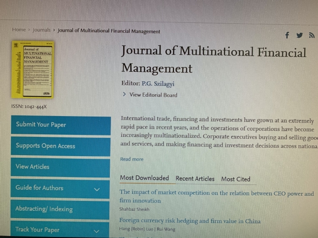 bevictor伟德罗航教授与王蕊博士合作撰写的论文“Foreign currency risk hedging and firm value in China”在SSCI期刊 Journal of Multinational Financial Management(JMFM)上发表,由Elsevier(爱思维尔)出版社出版。目前在JMFM论文下载排名(Most Downloaded)中名列第二。